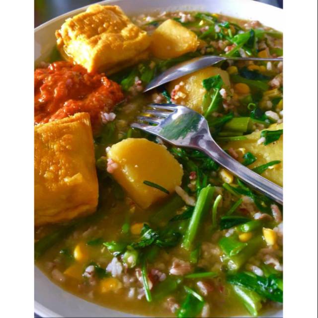 It is basically a rice porridge cooked with sweet potatoes, cassava, pumpkin and also veggies like spinach, water spinach (kangkung), corn kernels, and serve with toppings such as sambal, crispy fried shallots.