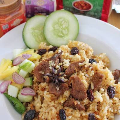 Nasi kaya rempah ini biasa disajikan dengan daging kambing atau ayam.