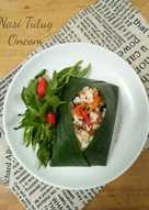 500 gr nasi putih 250 gr tumis oncom 10 bh telur puyuh pindang 1 lbr telur dadar daun pisang untuk membungkus.