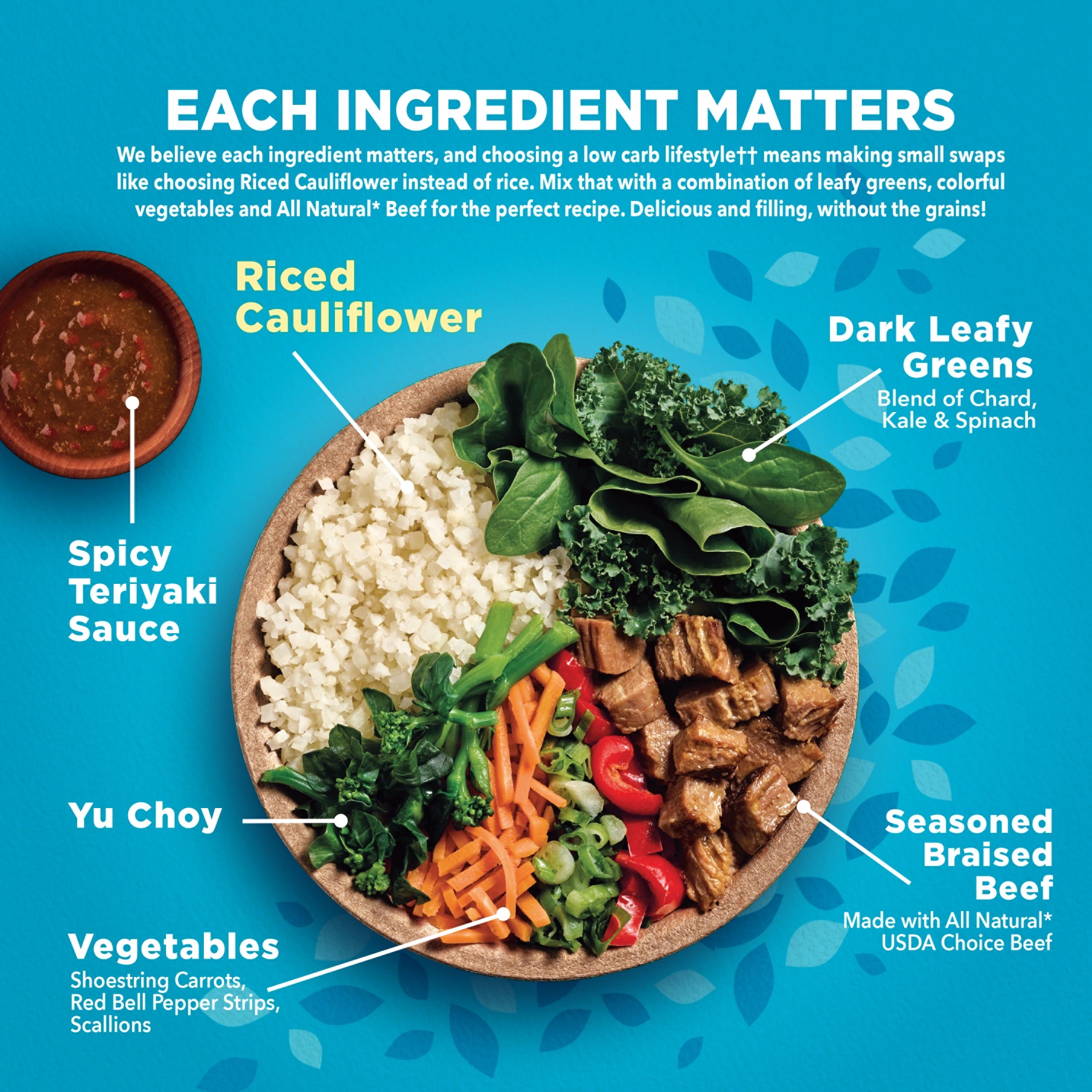 View Spicy Beef Teriyaki Power Bowl Nutrition Images. There are 170 calories in a 1 meal serving of healthy choice power bowls spicy beef teriyaki. Beef sirloin steak with broccoli, tomatoes and water chestnuts in a tasty teriyaki sauce, served over fluffy white rice.
